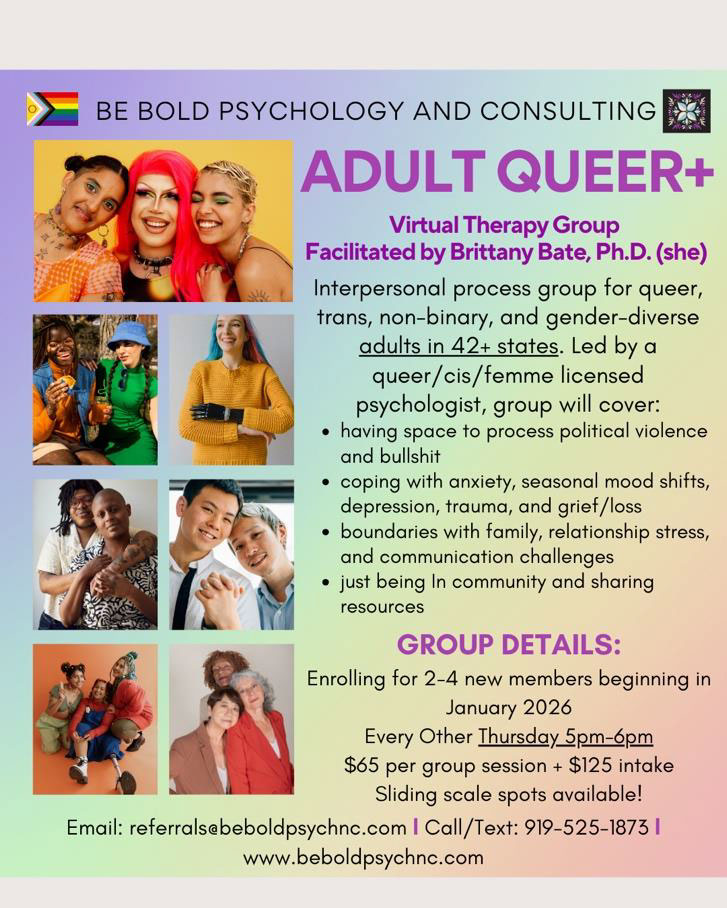 A flief for a grief and loss group therapy that is offered at Be BOLD Psychology. Online group therapy is an option for online therapy for grief in North Carolina.Flier for an adult queer+ online group therapy offered in North Carolina. Showing the details for participating in the support groups.