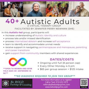 At Be BOLD Psychology and Consulting, we are proud to offer specialized virtual therapy groups for adults and teens across North Carolina, Virginia, and PsyPact states. Our therapy groups are affirming, accessible, and community-focused – designed to meet the unique needs of Autistic folks, ADHDers, LGBTQIA+ communities, teens, and more!