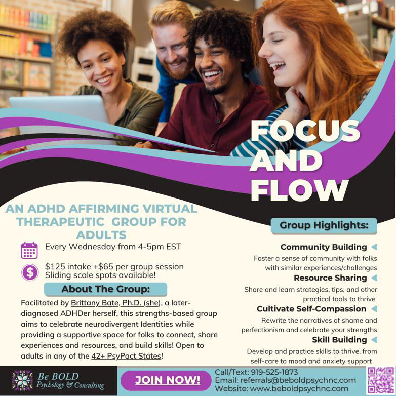 No formal diagnosis is required—self-diagnosed ADHDers are welcome. Interested members can join the waitlist now to secure their spot. To join, email referrals@beboldpsychnc.com or complete this Google Form.